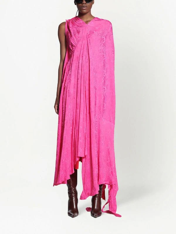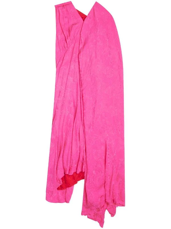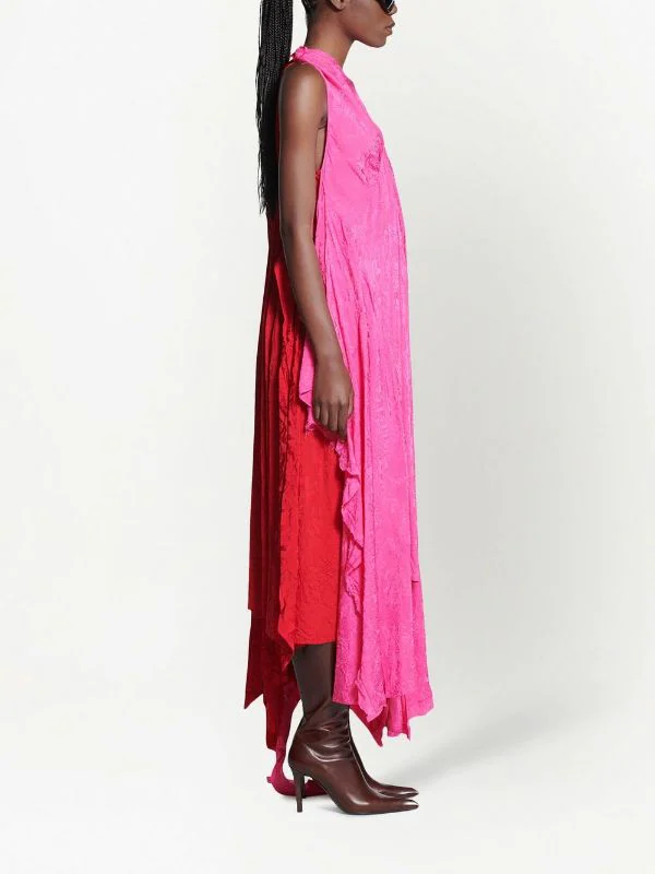 Rose vif, rouge cardinal, coupe évasée, design en jacquard, empiècements contrastants, épaules dénudées, détails de fronces, ourlet asymétrique.