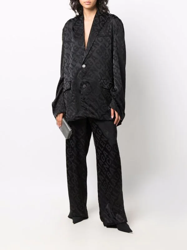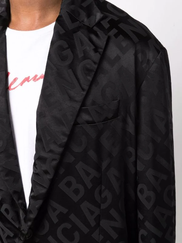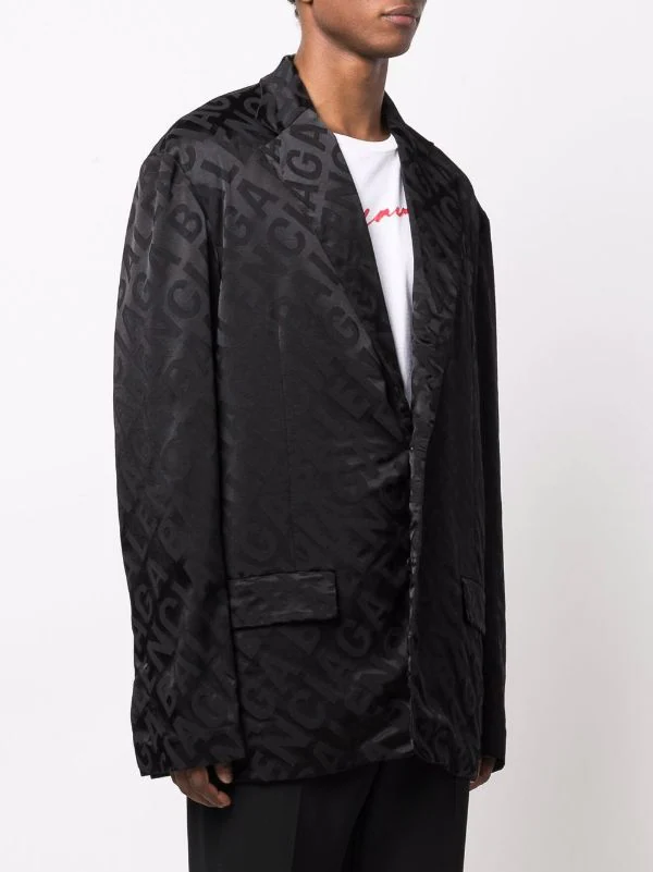 Motif monogrammé brodé, poche passepoilée sur la poitrine, fente arrière, revers crantés, deux poches à rabat sur le devant, boutonnière sur le devant. Couleur : noir.