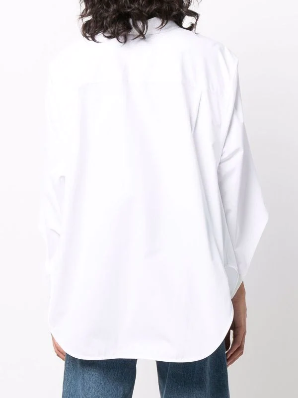 Manches chauve-souris, col classique, poche poitrine plaquée, ourlet incurvé, logo brodé, boutonnière sur le devant. Couleur : blanc.