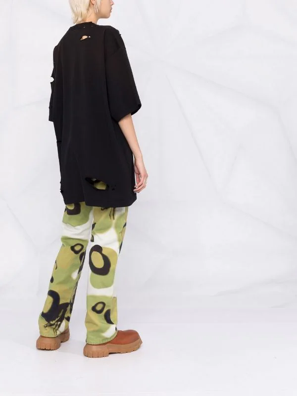 Encolure ronde, logo imprimé sur le devant, effet usé, finitions effilochées, ourlet droit, manches courtes. Couleur : noir. Matière : coton.