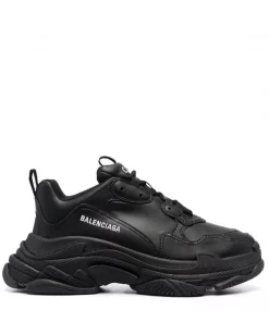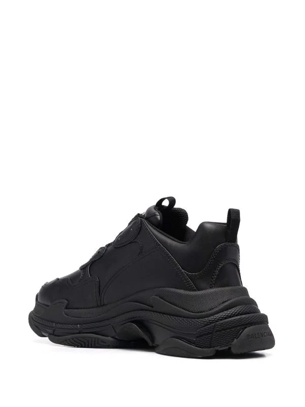 Nommées d’après la semelle signature en caoutchouc empilée, les baskets Triple S demeurent un modèle emblématique de Balenciaga. Mise à jour dans un noir monochromme pour PE22, la paire en cuir artificiel est présentée ici dans un design à empiècements épuré.