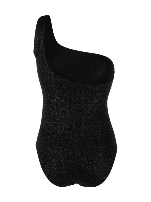 Noir, détails en lurex, logo doré, design asymétrique à une épaule, encolure asymétrique, doublure intégrale, construction stretch. Veillez à essayer les maillot de bain par-dessus vos propres sous-vêtements.