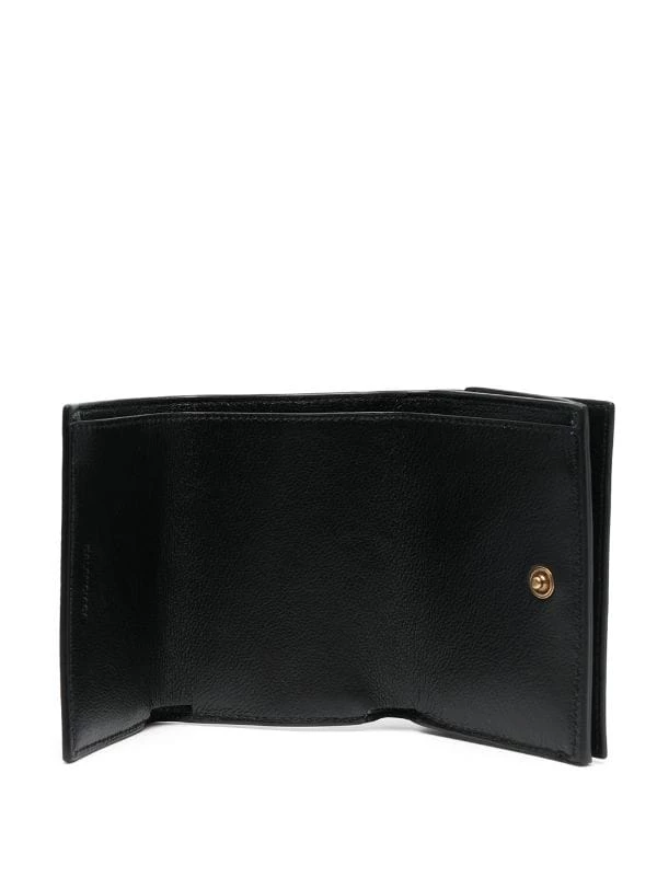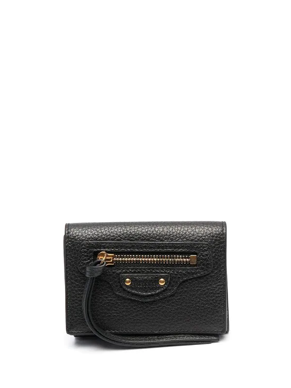 Mini portefeuille Neo Classic en cuir Balenciaga avec texture grainée, poche zippée, logo embossé, fermeture à bouton pression et design pliant. Couleur: noir.