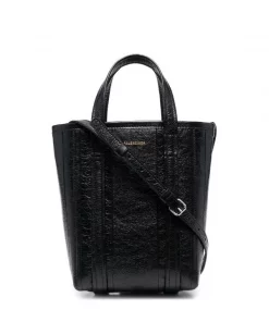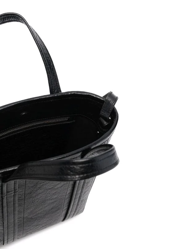 Fini texturé, logo embossé sur le devant, bride porté épaule détachable et ajustable, poches intérieures zippées. Couleur : noir. Matière : cuir de veau.