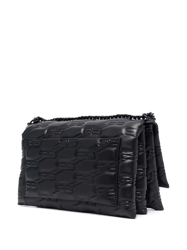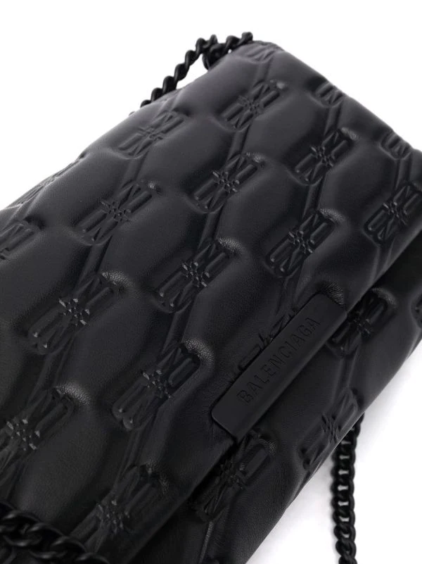 Effet matelassé, rabat sur le dessus à fermeture magnétique, plusieurs poches intérieures plaquées, bride porté épaule en chaîne. Couleur : noir. Matière : cuir.