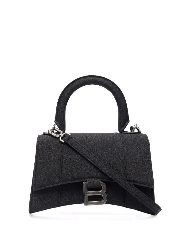 Défini par sa forme incurvée et sa silhouette structurée, ce sac à main XS Hourglass de Balenciaga est conçu avec une finition pailleté. Un logo argenté ‘B’ complète l’accessoire.