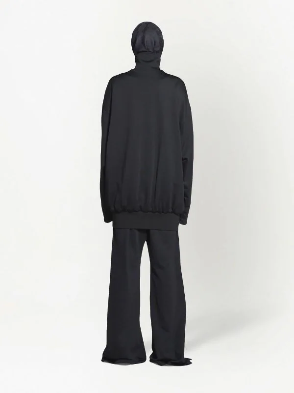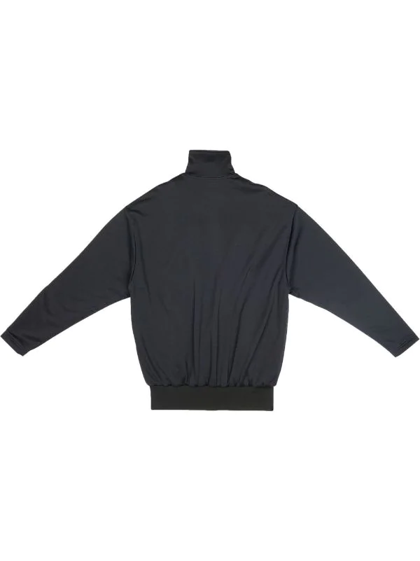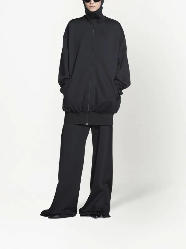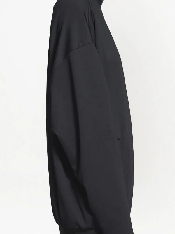Col montant, fermeture zippée devant, poches latérales fendues, manches longues, ourlet droit. Couleur : noir.