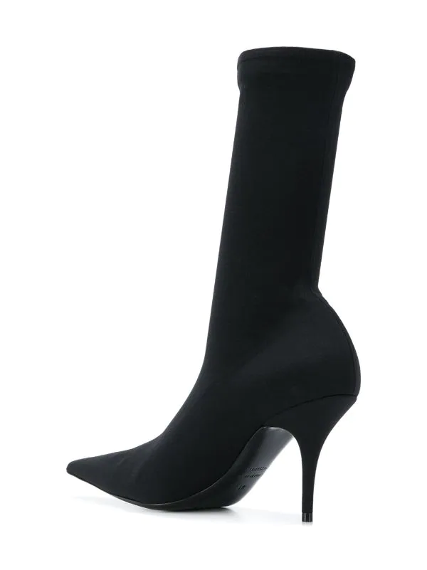 Bottines Knife Balenciaga avec bout pointu, longueur mi-mollet, un design à enfiler, talon aiguille mi-haut et semelle en cuir. Couleur : noir.