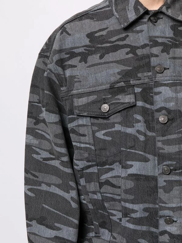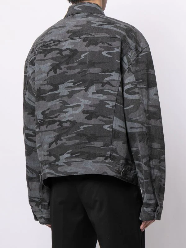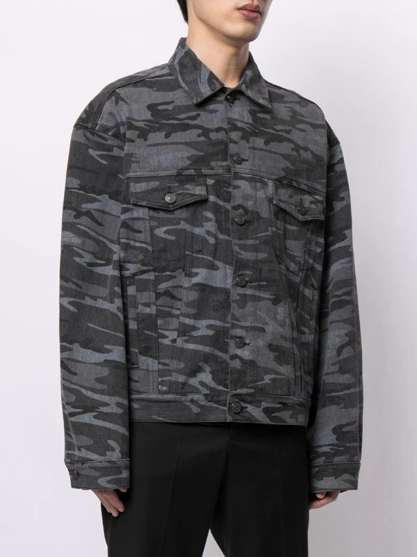 Imprimé camouflage, col classique, boutonnière sur le devant, manches longues, poignets boutonnés, poches latérales fendues, deux poches poitrine à rabat. Matière : coton.