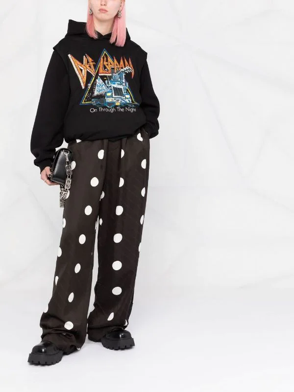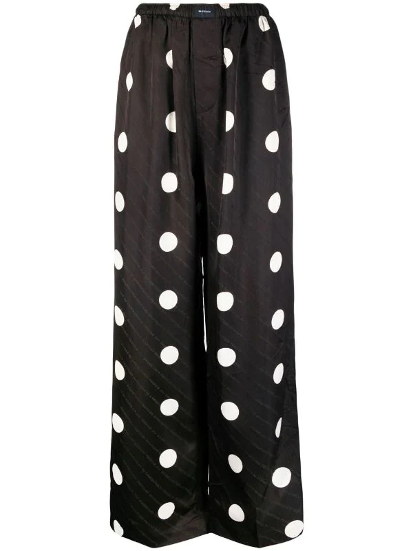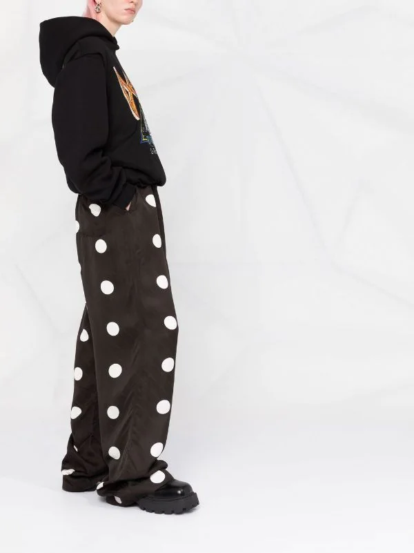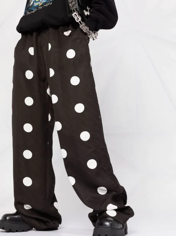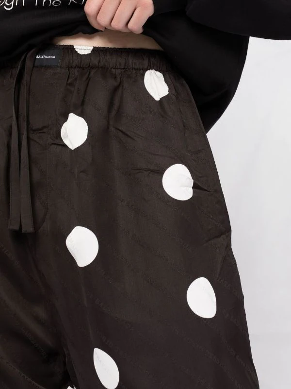 Coupe ample, imprimé à pois, jacquard à motif logo, patch logo sur le devant, ceinture élastique, deux poches latérales fendues.