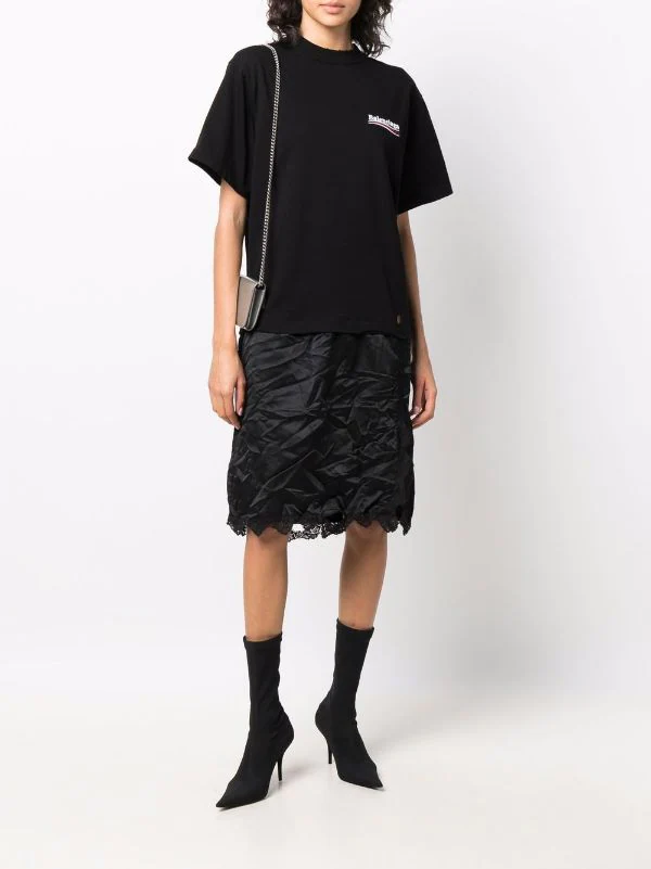 Logo brodé, détails superposés, détails en dentelle à fleurs, encolure ronde, manches courtes, coupe longue. Couleur : noir. Matière : coton.
