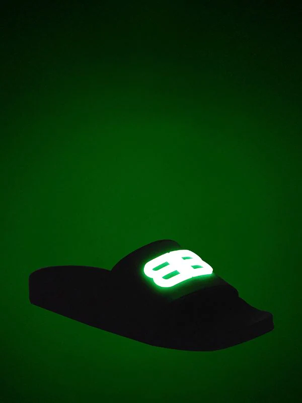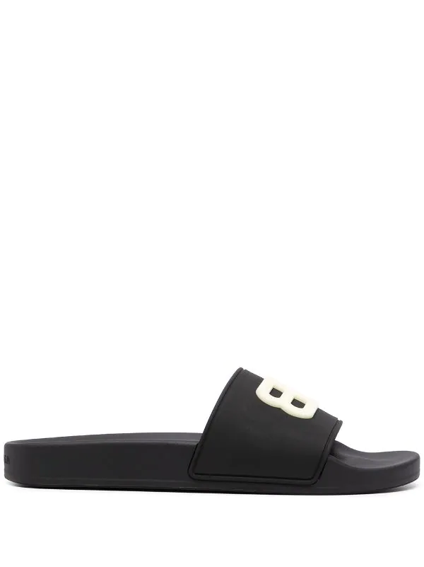 Détail de logo embossé, design à enfiler, bout ouvert, semelle en caoutchouc. Couleur : noir.