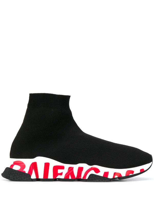 Imprimé graffiti, cheville style chaussette, bout en amande, semelle épaisse en caoutchouc. Couleur : noir.
