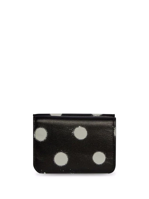 Imprimé à pois, logo imprimé sur le devant, fermeture à boutons pression, poche ticket, fentes pour carte intérieures, compartiments intérieurs pour carte. Matière : cuir.