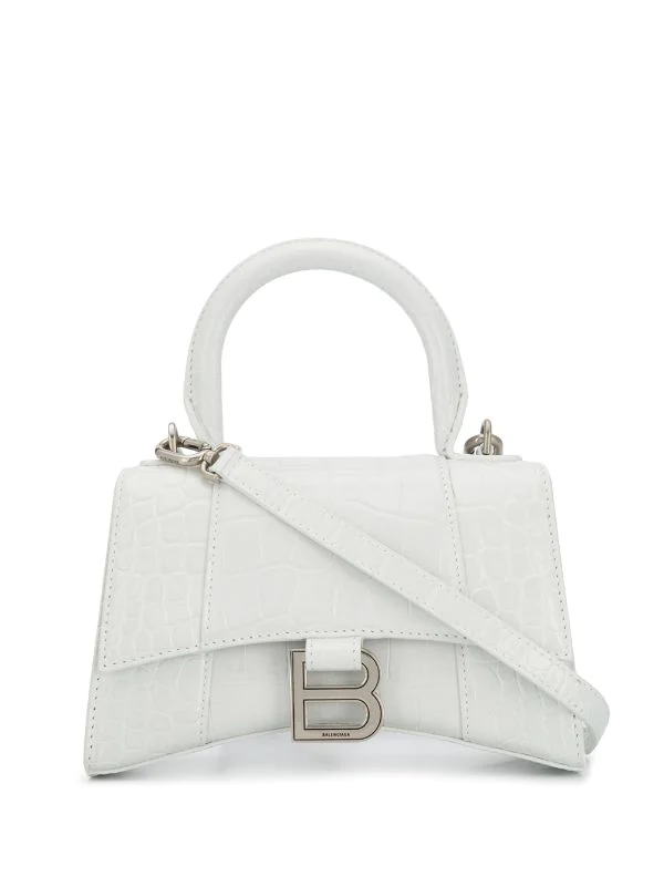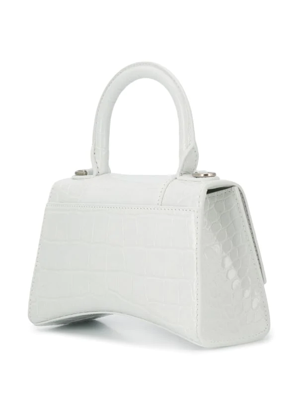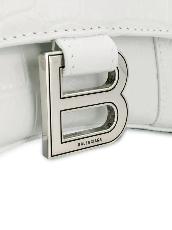 Mini sac à main à effet peau de crocodile en cuir Balenciaga avec effet peau de crocodile, plaque logo, rabat à fermeture magnétique, anse arrondie, bride portée épaule amovible et design structuré. Couleur: blanc.