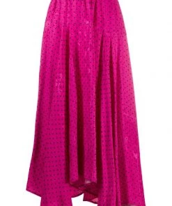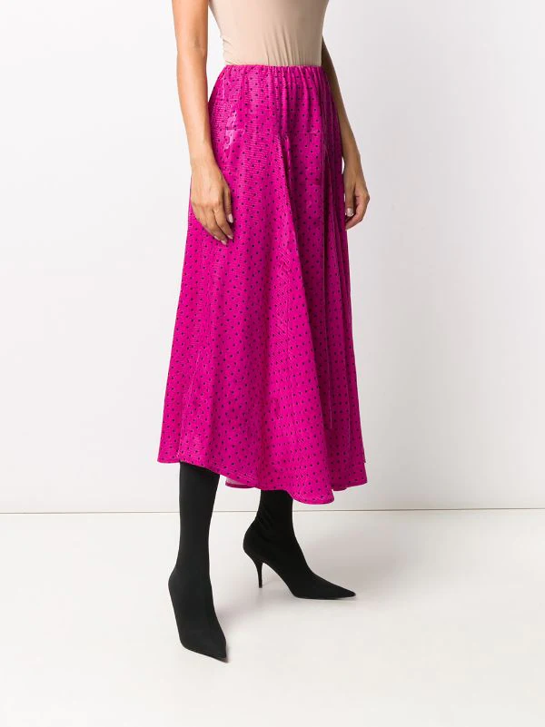 Imprimé à pois, taille haute, ourlet asymétrique, coupe mi-longue.