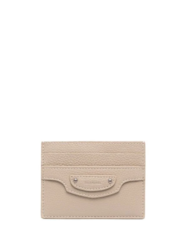 Taupe, cuir de veau, coutures ton sur ton, fentes pour carte, détails de clous argentés, logo embossé sur le devant, logo imprimé à l’intérieur.
