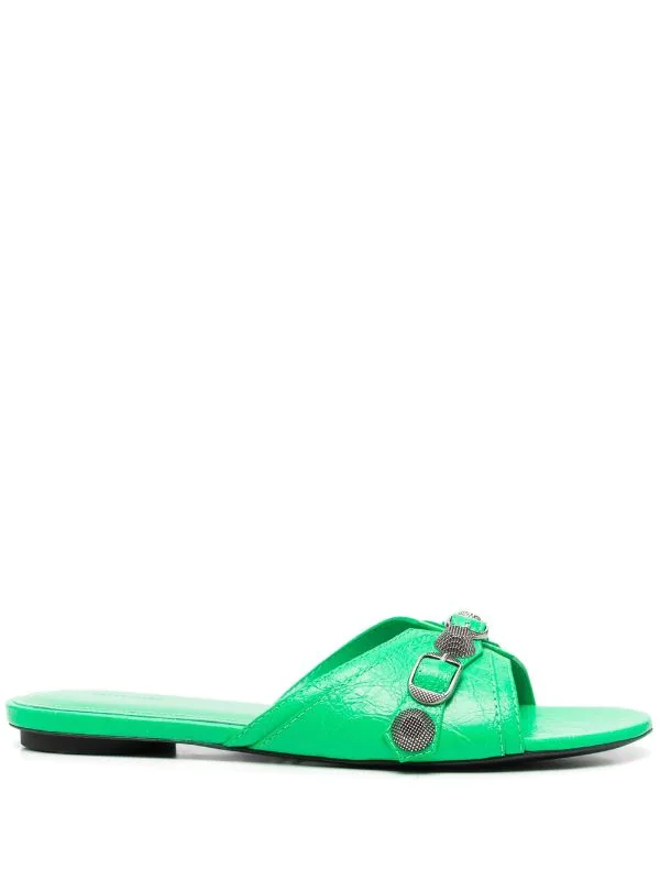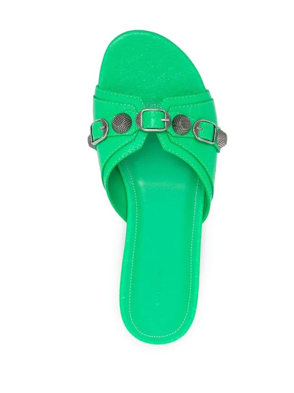 Vert, cuir, doublure en cuir, détail de boucle décorative, bout ouvert, design à enfiler, semelle intérieure à logo, petit talon.
