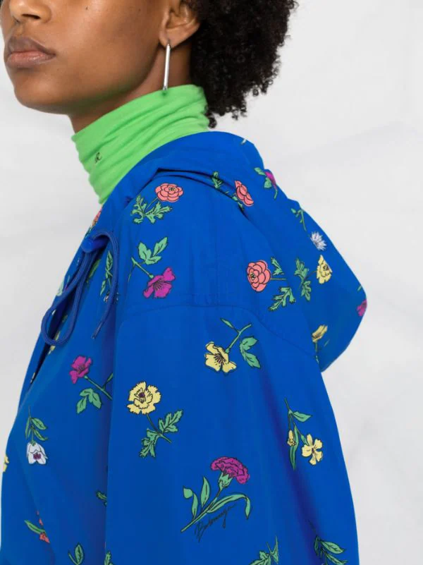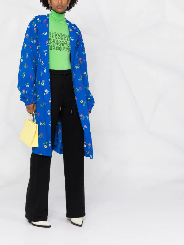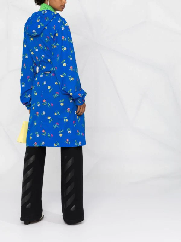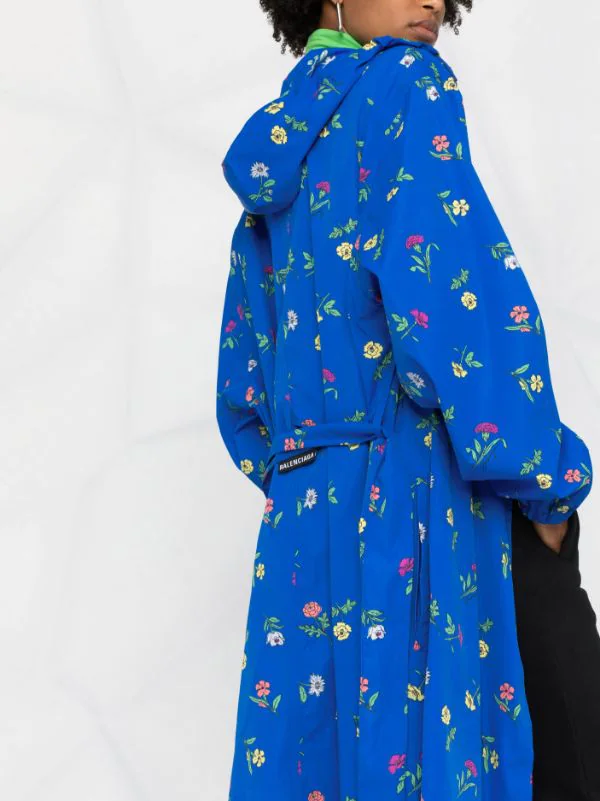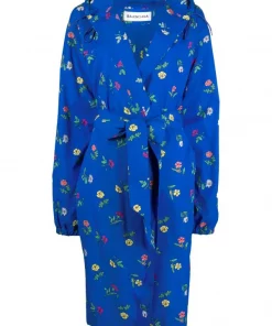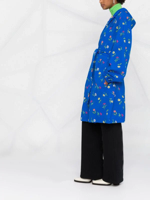 Motif de fleurs, capuche classique, poches latérales fendues, taille ceinturée, manches longues. Couleur : bleu.