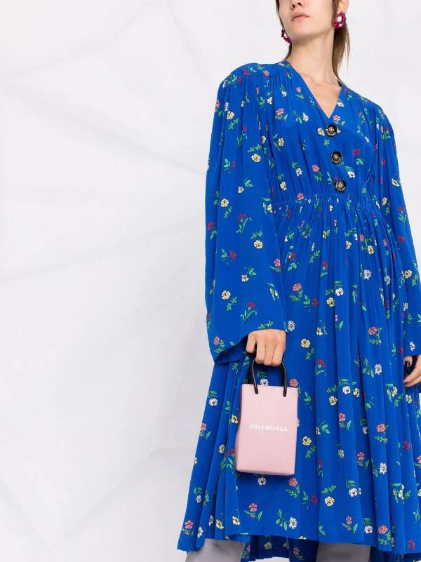 Motif de fleurs, détails de plis, col v, boutonnière sur le devant, manches longues, ceinture élastique, jupe évasée, ourlet droit, coupe mi-longue. Matière : soie.