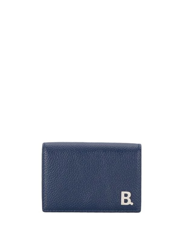 Portefeuille en cuir à logo B en Furs & Skins->Leather Balenciaga avec texture en cuir grainé, boutons pression, détails argentés et plaque logo argentée. Couleur: Dark blue.