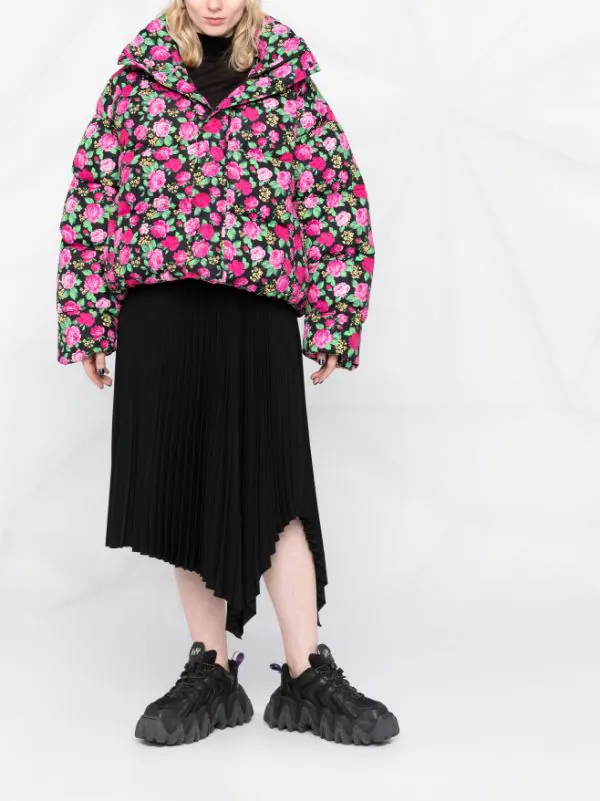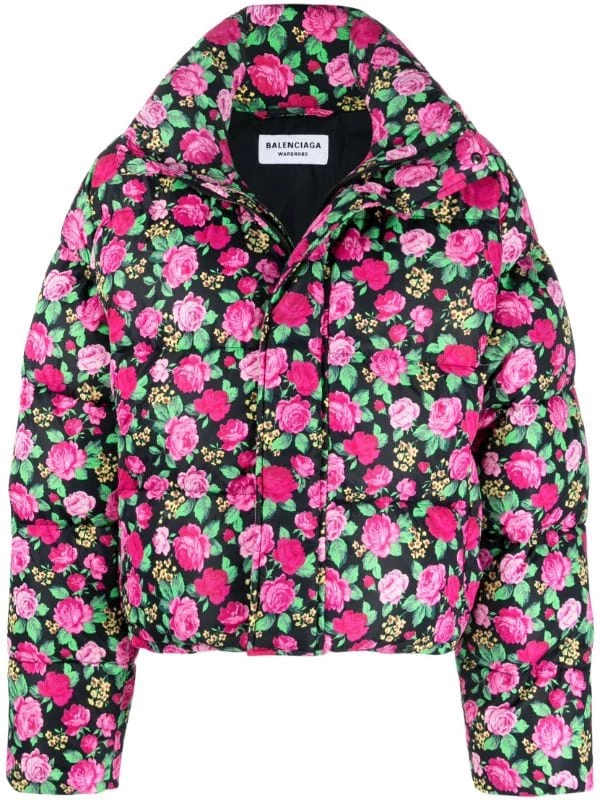 Motif de fleurs, col montant, fermeture dissimulée sur le devant, manches longues.