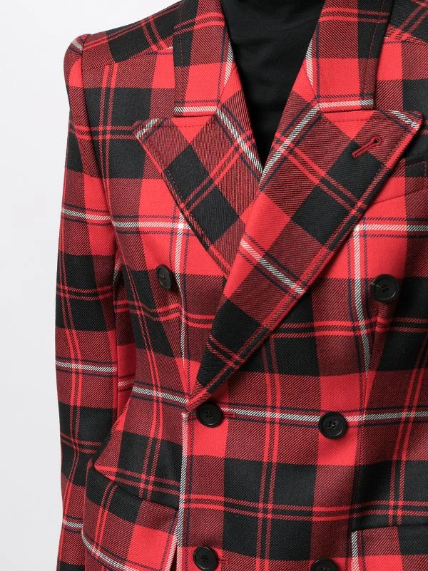 Revers crantés, boutonnière décalée sur le devant, poche passepoilée sur la poitrine, poches latérales à rabat, coupe cintrée, épaulettes. Couleur : rouge.