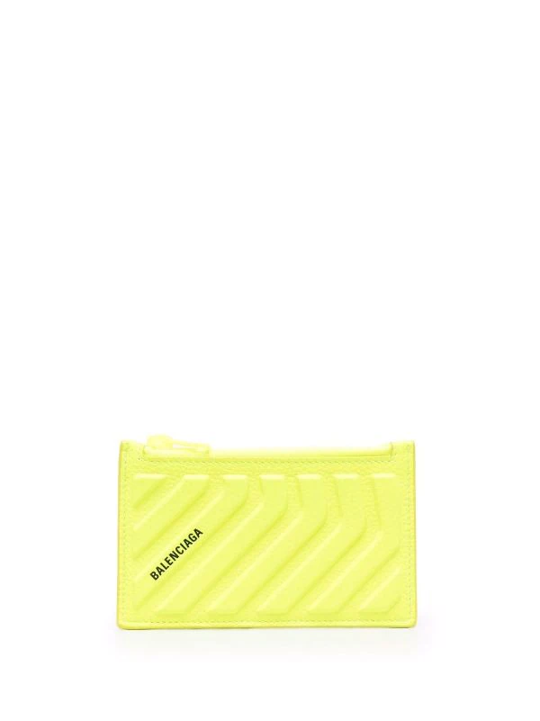 Texture grainée, logo imprimé sur le devant, fermeture zippée sur le dessus, fentes pour carte. Couleur : jaune. Matière : cuir de veau.
