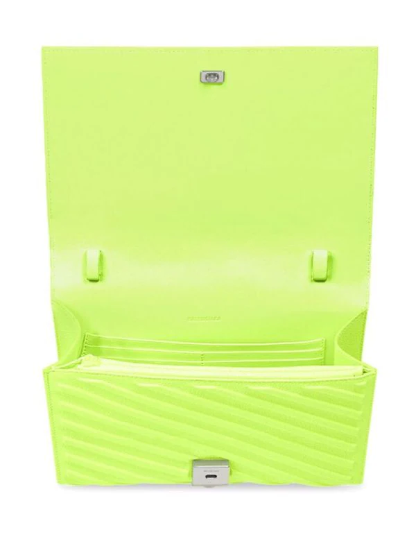 Bride porté épaule détachable et ajustable, compartiment principal, rabat sur le dessus, fermeture à loquet, compartiments intérieurs pour carte, logo intérieur embossé, détail embossé, logo imprimé sur le devant. Matière : cuir de veau.