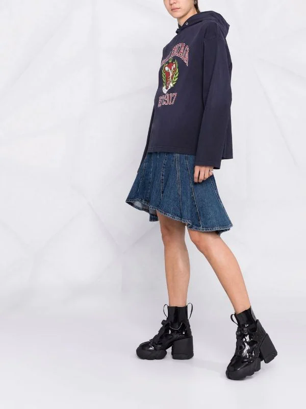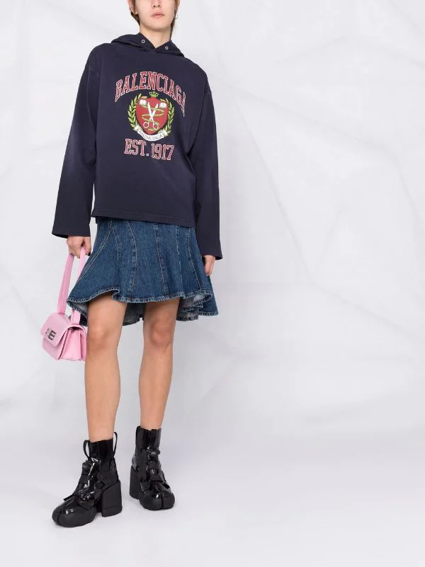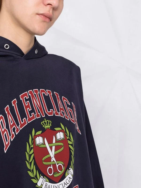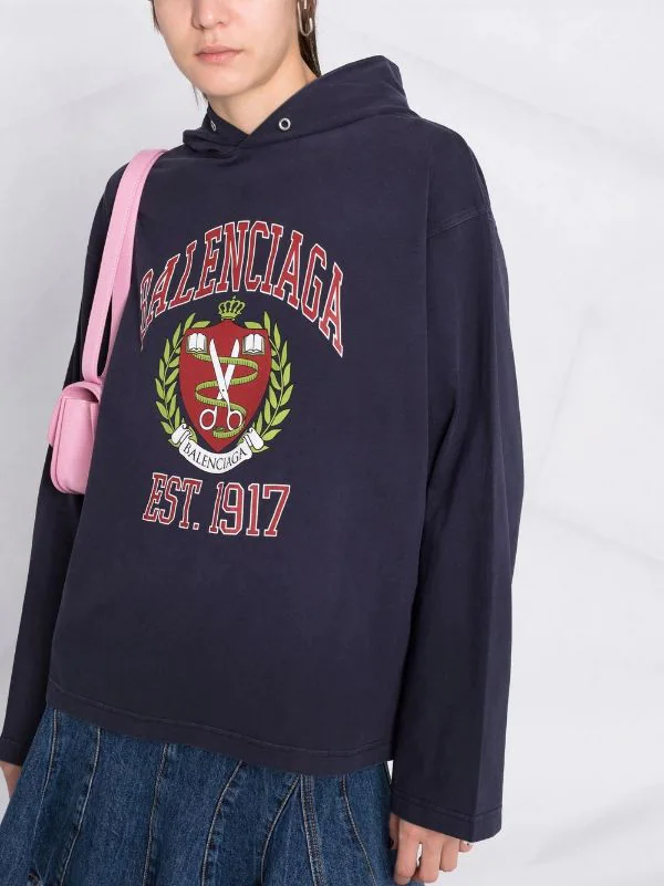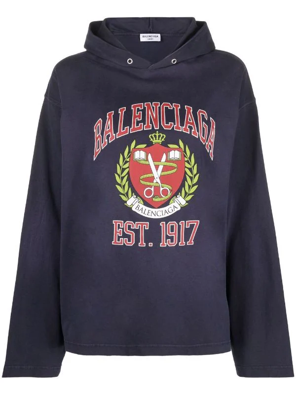 Motif héraldique, logo imprimé sur le devant, capuche classique, épaules tombantes, manches longues, ourlet droit. Matière : coton.