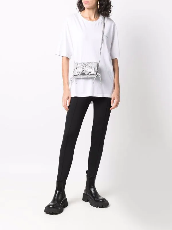 Empiècement en mesh, effet métallisé, détail de laçage, détail appliqué, bride porté épaule ajustable, rabat sur le dessus à fermeture magnétique, poche intérieure. Matière : cuir.