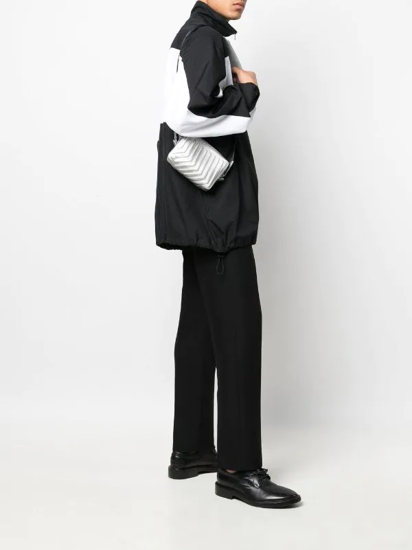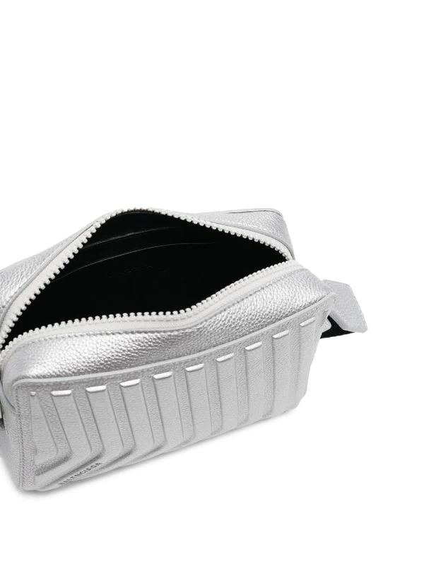 Argent, noir, cuir, fini texturé, logo imprimé sur le devant, fermeture zippée à double sens, bretelle portée épaule unique, compartiment principal.