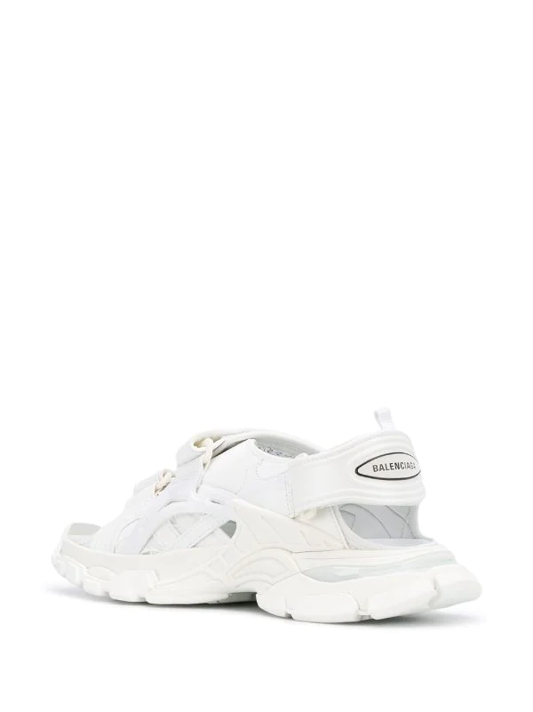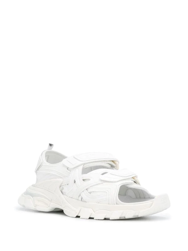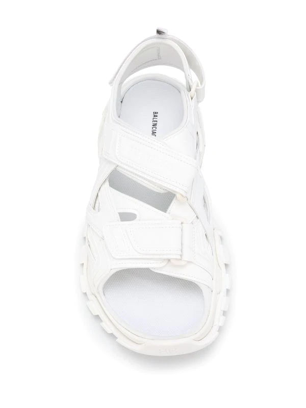 Sandales à fermetures scratch en néoprène Balenciaga avec monogramme sur le talon, logo embossé, languette arrière, a touch strap fastening, bout ouvert et semelle en caoutchouc. Couleur : blanc.