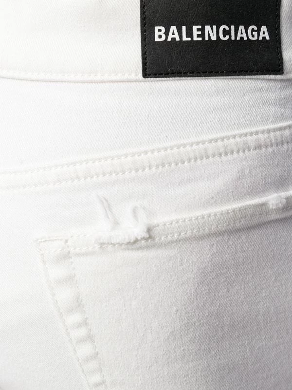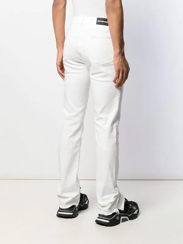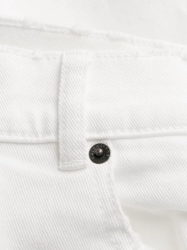 Jean Droit À Effet Usé Balenciaga avec taille normale, passants de ceinture à la taille, bouton et zip, coupe classique cinq poches, micro stud details, coupe longue et plaque logo au dos. Couleur : blanc.