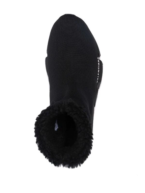 Finitions en fourrure artificielle, cheville style chaussette, logo lettre, design à enfiler, bout en amande, semelle épaisse en caoutchouc. Couleur : noir.