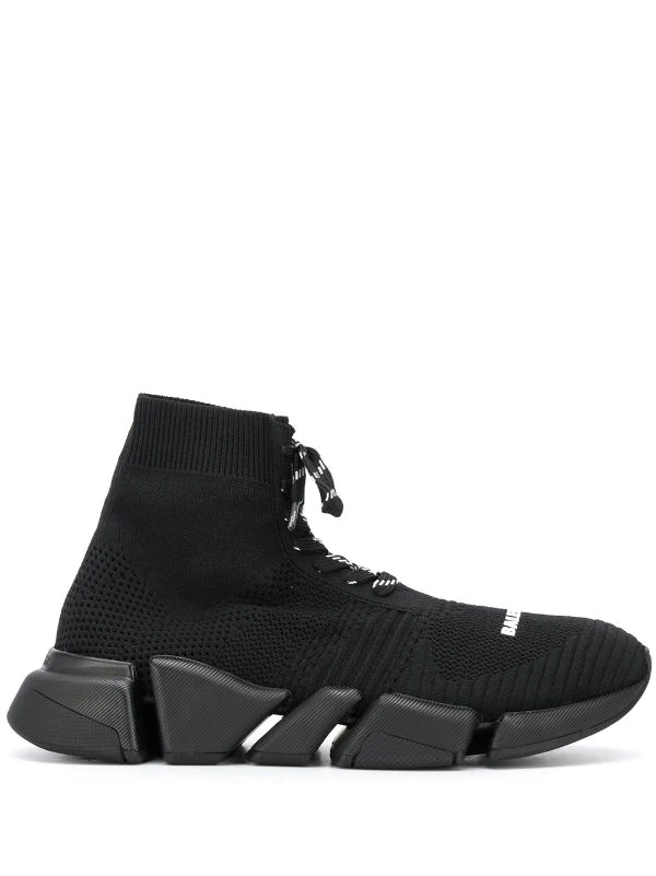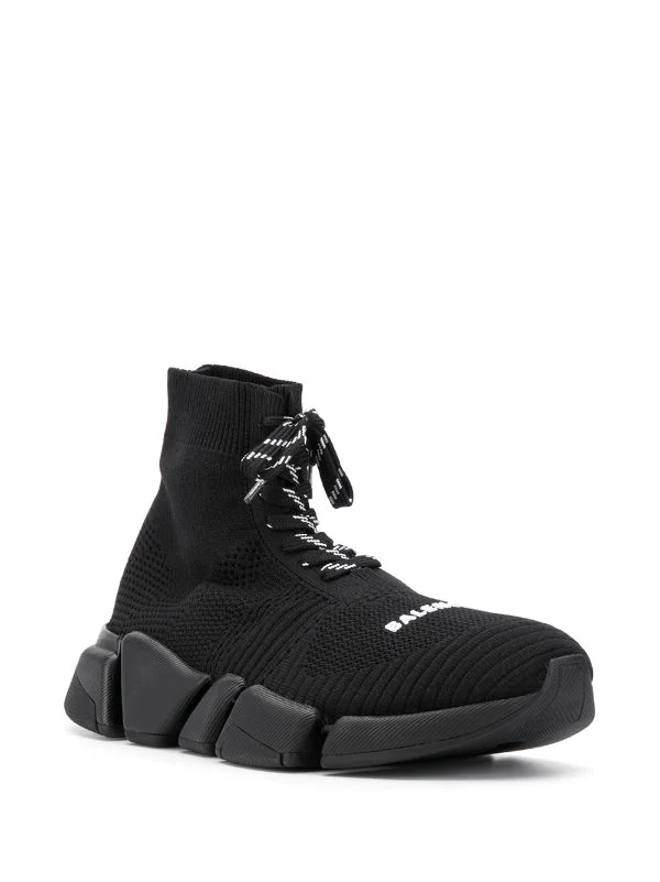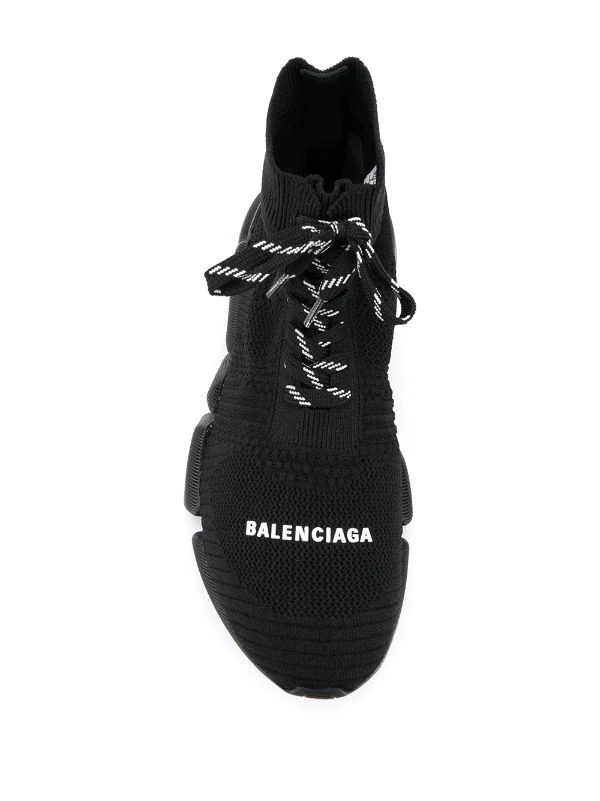 Baskets Speed 2.0 à lacets Balenciaga avec bout rond, logo brodé sur le devant, fermeture à lacer sur le devant, semelle épaisse en caoutchouc et cheville style chaussette. Couleur: noir.