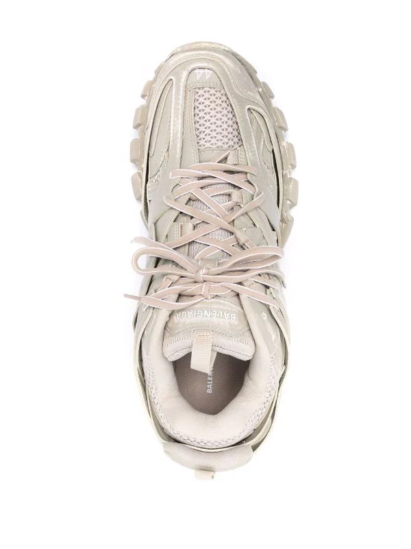 Les baskets Track de BALENCIAGA s’inspire des chaussures de course pour son design. Elles sont présentées ici dans un ton beige délavé pour une touche décontractée.