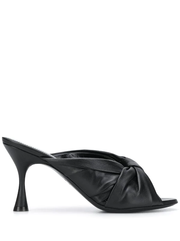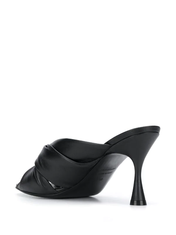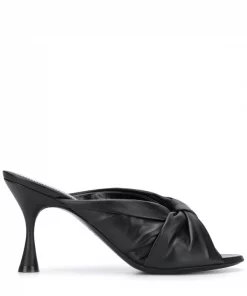 Design drapé, bout ouvert, dos-nu, design à enfiler, talon sculpté haut. Couleur : noir. Matière : cuir.