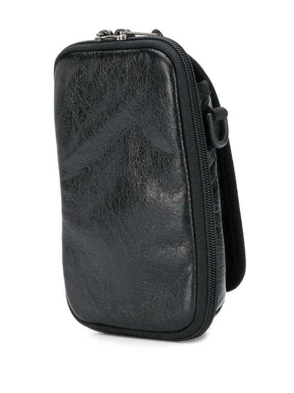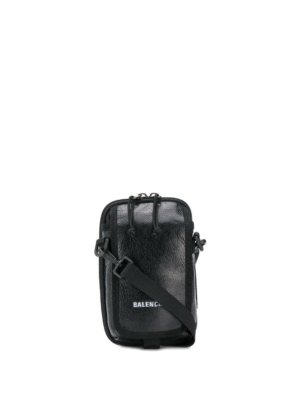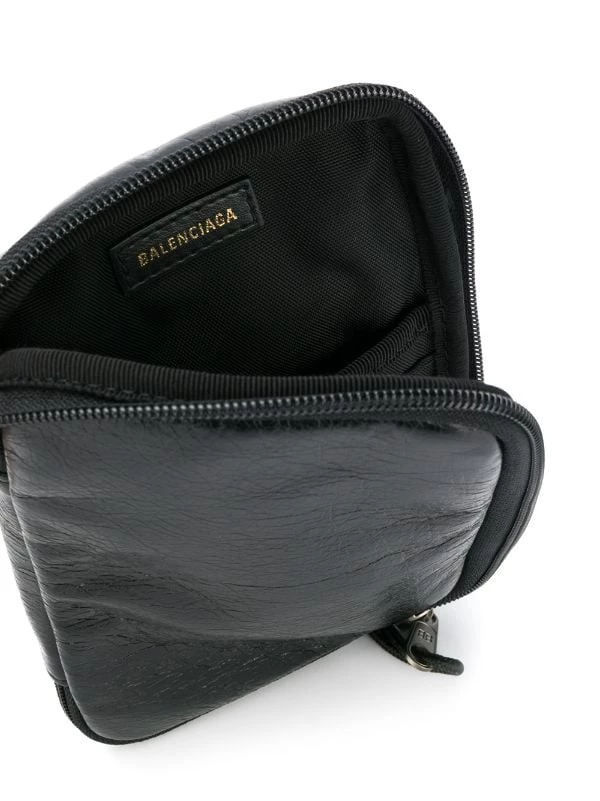 Sacoche Explorer en cuir Balenciaga avec fermeture zippée tout autour, rabat sur le devant, logo embossé et bandoulière. Couleur: noir.