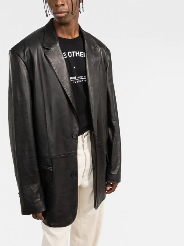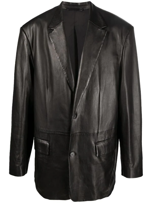 Revers crantés, boutonnière sur le devant, manches longues, deux poches à rabat sur le devant. Couleur : noir. Matière : peau d’agneau.