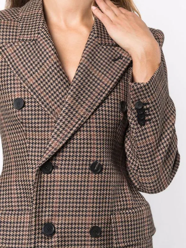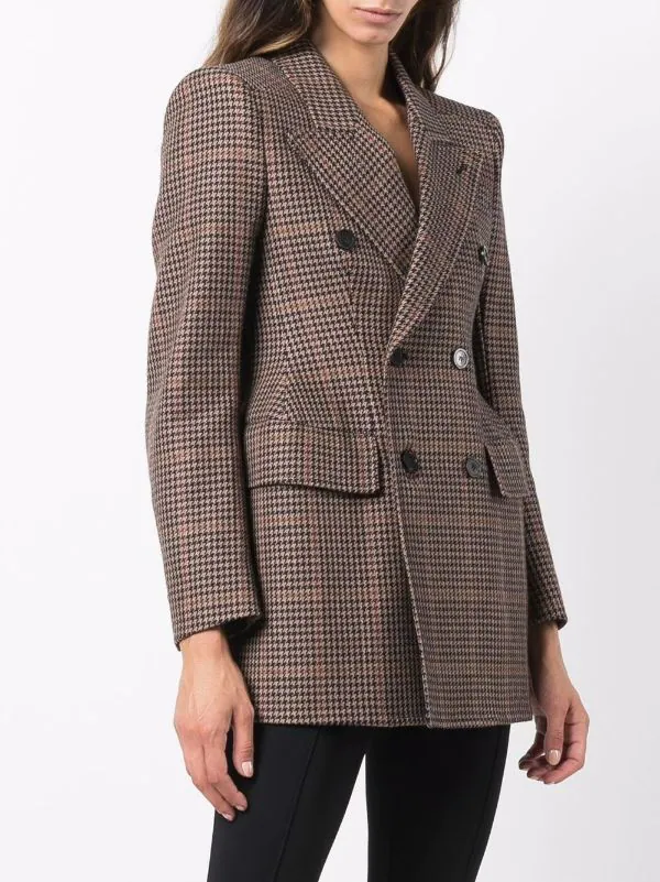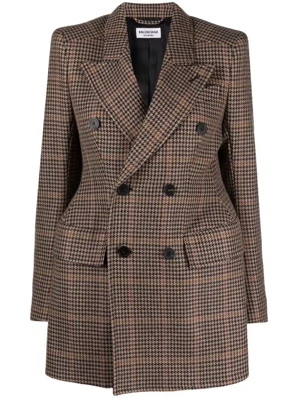 Carreaux, revers pointus, poches devant à rabat, boutonnière croisée, manches longues, poignets boutonnés.