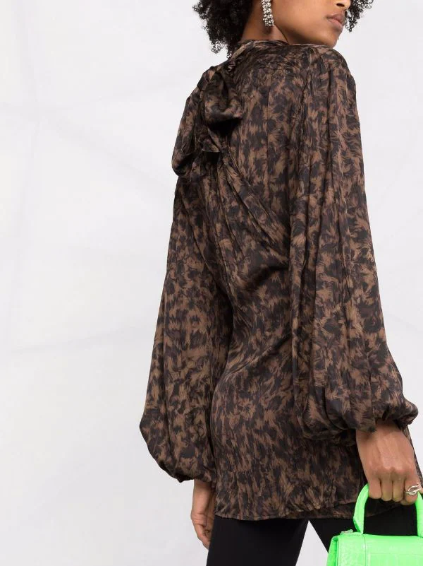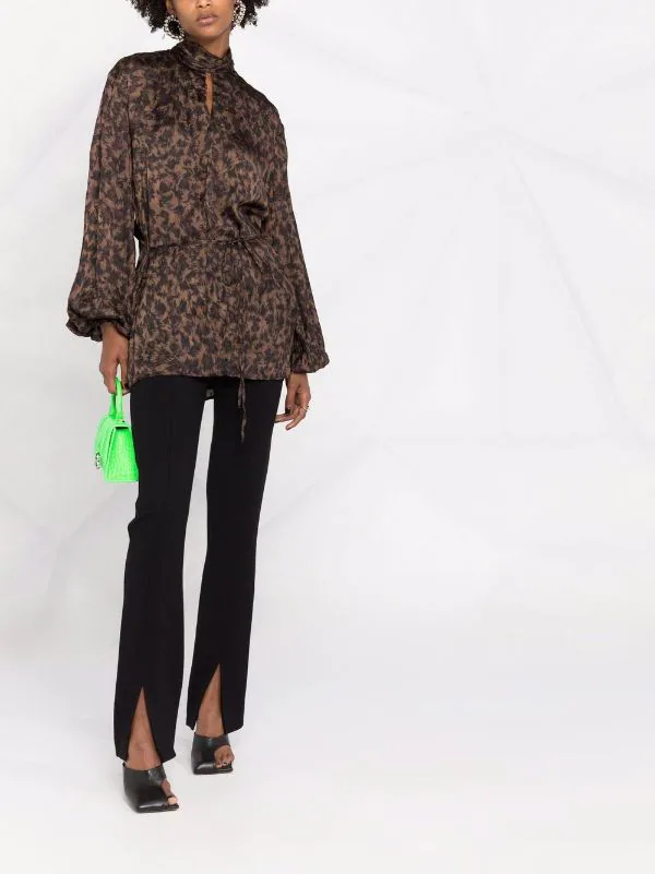 Imprimé léopard, col lavallière à nouer, lien de resserrage à la taille, manches bouffantes longues. Couleur : marron.