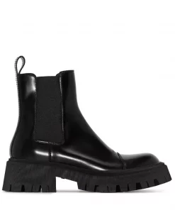 Longueur cheville, empiècements élastiqués sur les côtés, bout rond, semelle crantée en caoutchouc. Couleur : noir. Matière : cuir.