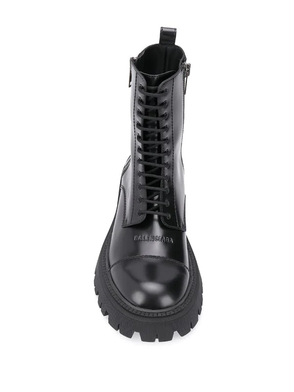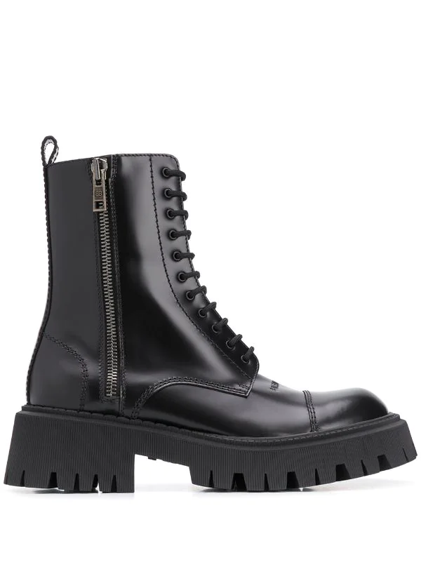 Bout rond, fermeture à lacer sur le devant, fermeture zippée sur le côté, languette d’enfilage au talon, semelle épaisse en caoutchouc. Couleur : noir.