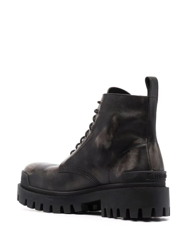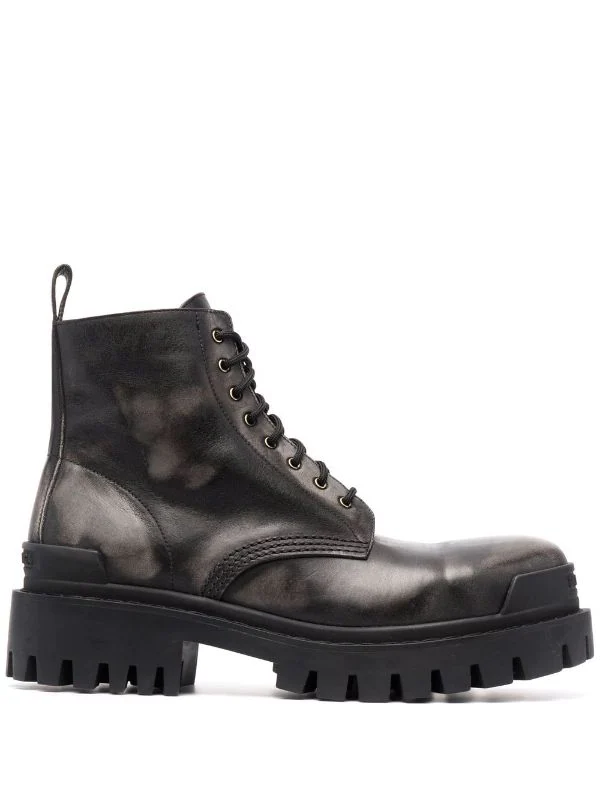 Effet usé, languette d’enfilage au talon, fermeture à lacer sur le devant, bout en amande, semelle crantée en caoutchouc. Couleur : noir. Matière : cuir de veau.