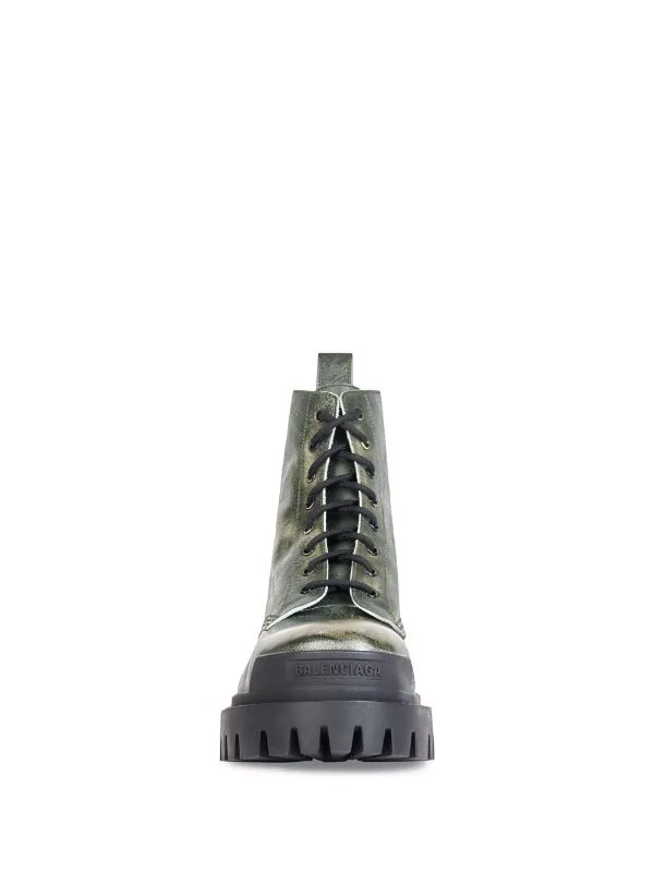 Les semelles en caoutchouc épais des bottes Strike de Balenciaga témoignent des silhouettes exagérées de la marque. Cette paire a une apparence habilement usée qui lui donne l’air d’une paire de chaussures favorite portée par l’amour.