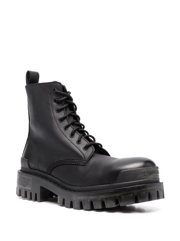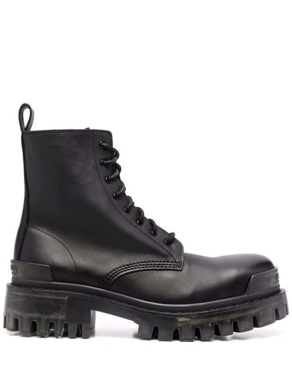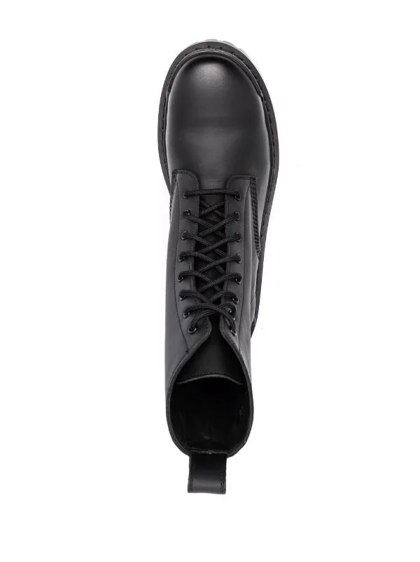 Languette d’enfilage au talon, fermeture à lacer sur le devant, bout rond, semelle épaisse crantée en caoutchouc. Couleur : noir. Matière : cuir.