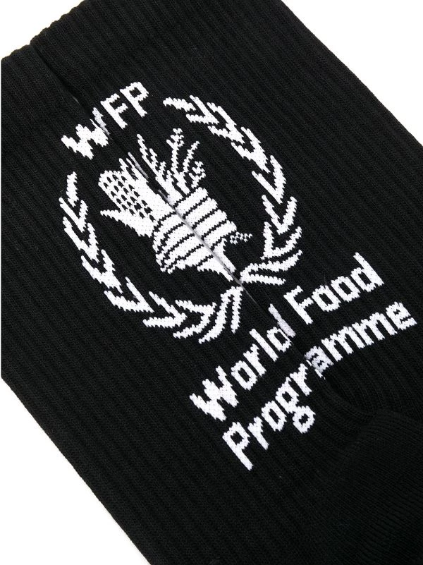 Chaussettes imprimées World Food Programme Balenciaga avec bordure nervurée, logo à l’extérieur, coupe stretch, détails de coutures et hauteur cheville. Les chaussettes et la bonneterie doivent être retournés dans leur emballage d’origine.