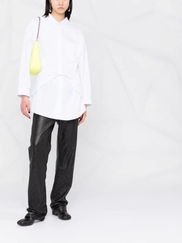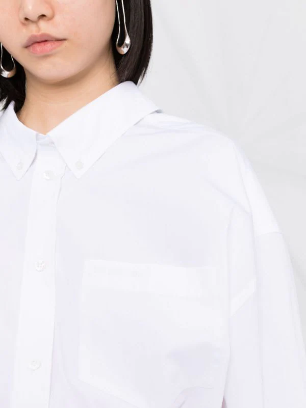 Tissage popeline, taille ceinturée, col pointu, boutonnière sur le devant, manches longues, poignets boutonnés, ourlet incurvé. Couleur : blanc. Matière : coton mélangé.