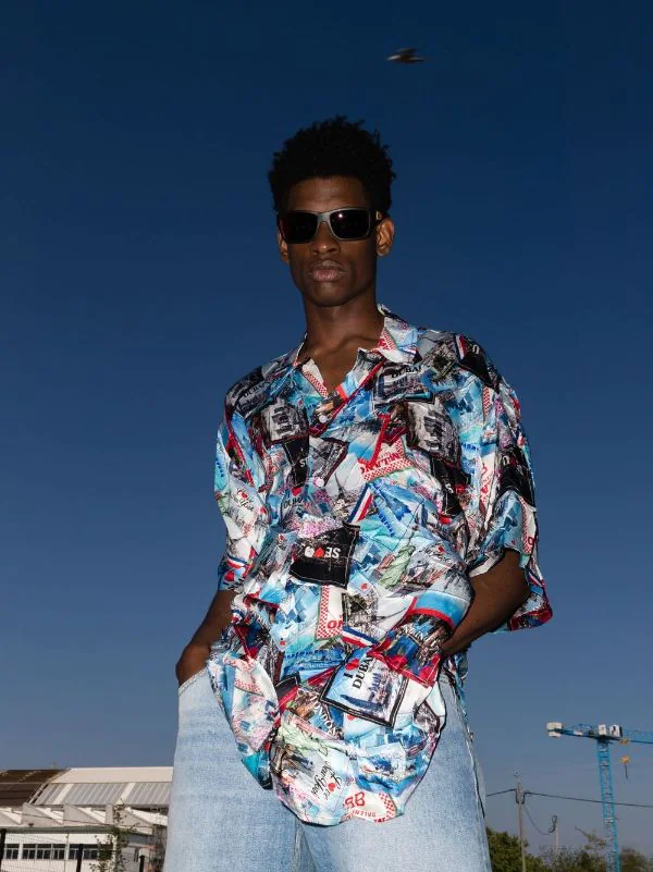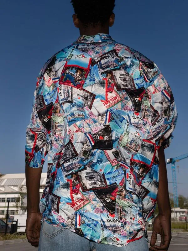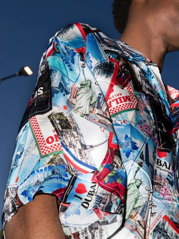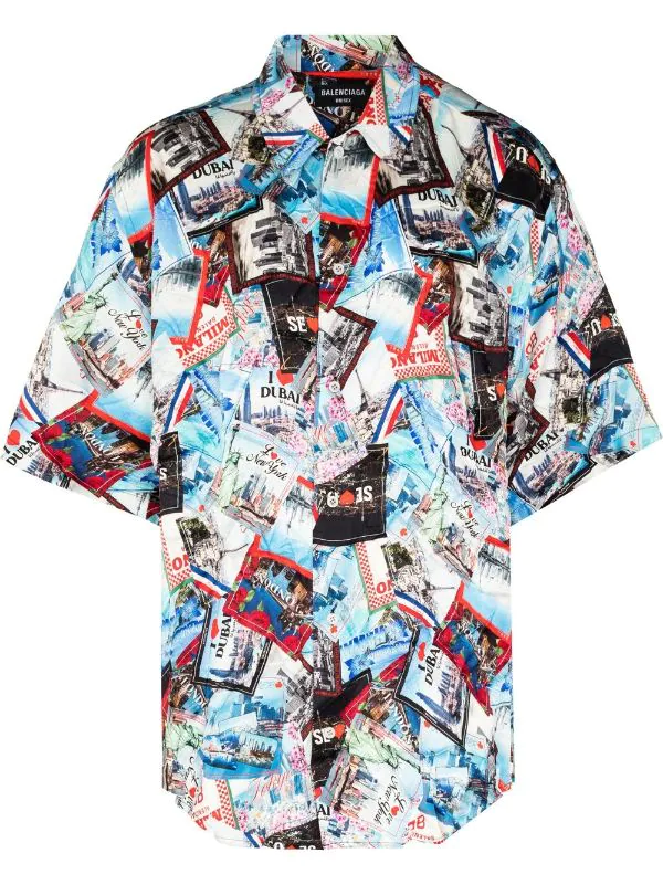 Multicolore, soie, col cubain, boutonnière sur le devant, manches courtes, imprimé graphique intégral, ourlet incurvé.